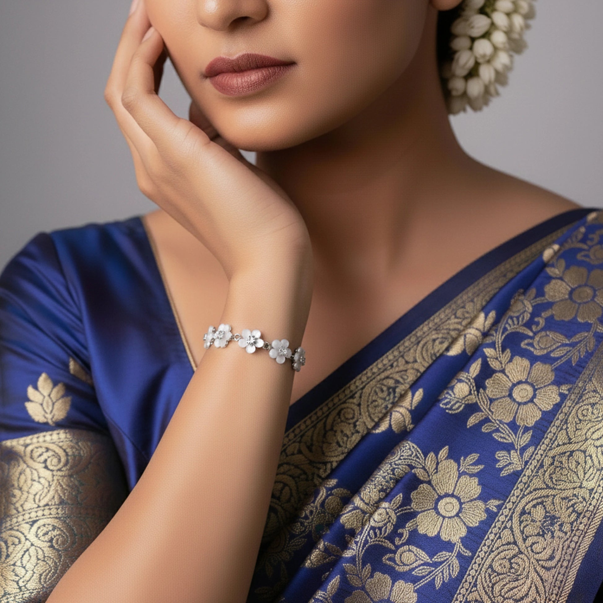 Embrace a touch of nature with this charming bracelet featuring a row of delicate flower-shaped charms. Each flower is crafted with white enamel, adding a touch of elegance and sophistication. The silver-tone finish gives the bracelet a timeless look that complements any outfit. This is the perfect accessory for adding a touch of femininity and grace to your everyday style. Whether you're treating yourself or looking for a thoughtful gift for a loved one, this bracelet is sure to delight.