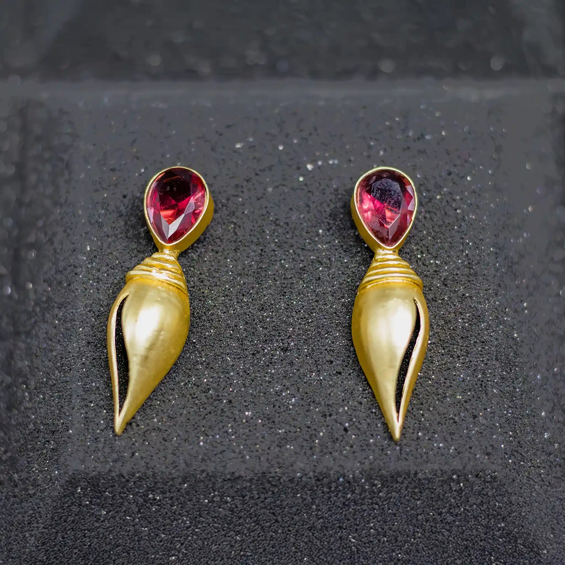 Step into timeless luxury with Divamas’ handcrafted gold plated earrings, featuring an exquisite shankh-inspired design. The raw red stone at the top adds a bold yet refined charm, perfect for elevating any traditional or contemporary outfit. These earrings reflect artisanal finesse, making them ideal for weddings, festive wear, or high-end gatherings. Made from premium quality brass with a radiant gold polish, the unique structure combines tradition and modern elegance. Lightweight yet statement-making, this pair is designed for the woman who loves to express herself with confidence and grace. A true blend of artistic craftsmanship and luxury fashion — only from Divamas.